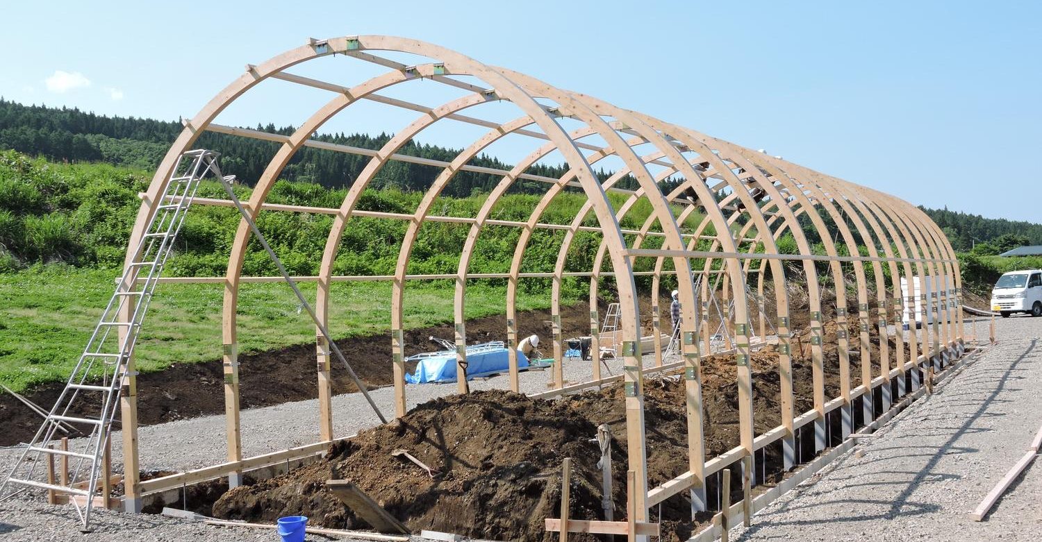「G-NEXUS FRAME(ジーネクサスフレーム)」を使った木製ビニールハウスは、雪国での農業の普及を目指し開発しました。